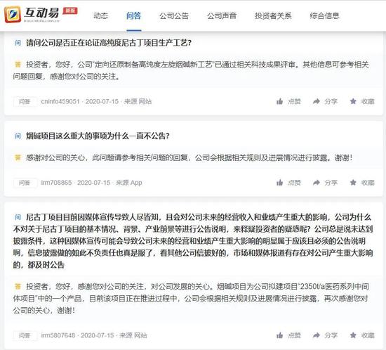 然而,对于尼古丁项目这个令公司股价产生如此巨大波动的重大事件,金城医药至今仍未公告作出解释或澄清,同样引起了部分股民的疑问。不过在另一方面,金城医药在互动易平台上倒是多次回答投资者关于该项目的提问,例如“该项目正在有序推进中”“投产时间尚待根据项目建设进度情况确定”“(项目)工艺已经过相关评审,目前正在进行项目的前期准备工作”等。