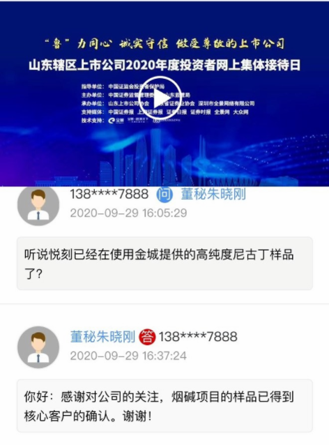 《每日经济新闻》记者注意到,除了互动易平台外,金城医药董秘朱晓刚还在“山东辖区上市公司2020年度投资者网上集体接待日”明确回答称:“烟碱(尼古丁)项目的样品已得到核心客户的确认”,并确认悦刻等知名电子烟厂商已和公司洽谈尼古丁项目。