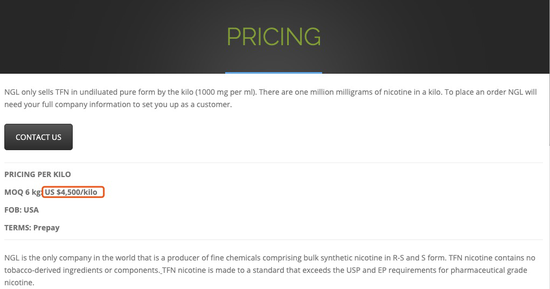 《每日经济新闻》记者从美国精细化学品生产商NextGenerationLabs的官网上获悉,公司销售的化学合成尼古丁报价为4500美元/千克,一吨的价格即为450万美元。按照目前的汇率来计算,一吨化学合成尼古丁的价格约为2963万元人民币。按照金城医药每年200吨尼古丁的产能来看,该项目每年将为公司带来近60亿元人民币的销售额。