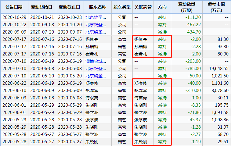 2020年7月16日,金城医药副总经理杨修亮通过集中竞价交易减持2万股,套现约81.3万元。同日,金城医药财务总监孙瑞梅通过集中竞价交易减持2.28万股,套现约94万元。同日,金城医药副总经理崔希礼通过集中竞价交易减持2万股,套现约80万元。