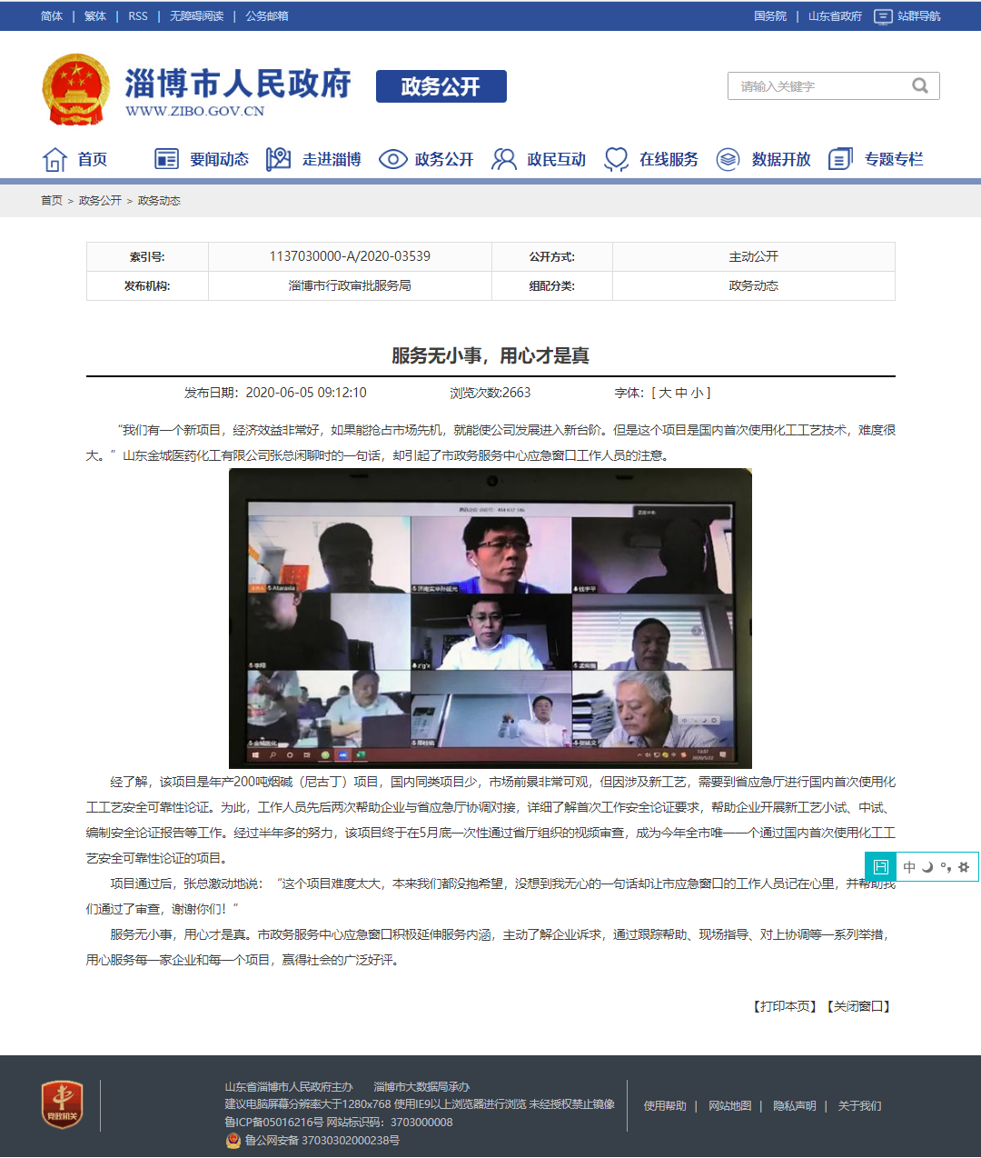 文中称:“‘我们有一个新项目,经济效益非常好,如果能抢占市场先机,就能使公司发展进入新台阶。但是这个项目是国内首次使用化工工艺技术,难度很大。’山东金城医药化工有限公司张总闲聊时的一句话,却引起了市政务服务中心应急窗口工作人员的注意。经了解,该项目是年产200吨烟碱(尼古丁)项目,国内同类项目少,市场前景非常可观,但因涉及新工艺,需要到省应急厅进行国内首次使用化工工艺安全可靠性论证。为此,工作人员先后两次帮助企业与省应急厅协调对接,详细了解首次工作安全论证要求,帮助企业开展新工艺小试、中试、编制安全论证报告等工作。经过半年多的努力,该项目终于在5月底一次性通过省厅组织的视频审查,成为今年全市唯一一个通过国内首次使用化工工艺安全可靠性论证的项目。”