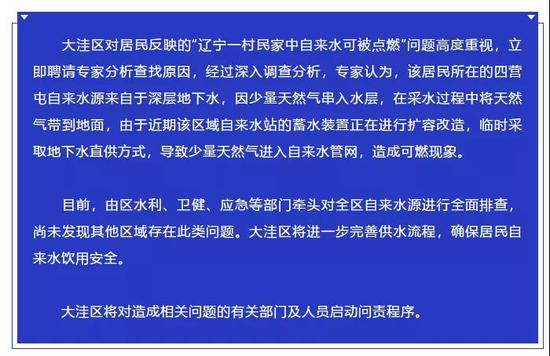 11月24日凌晨,村民们等了两年多的调查结果终于出来了:四营屯自来水源来自于深层地下水,因少量天然气串入水层,在采水过程中将天然气带到地面,由于近期该区域自来水站的蓄水装置正在进行扩容改造,临时采取地下水直供方式,导致少量天然气进入自来水管网,造成可燃现象。