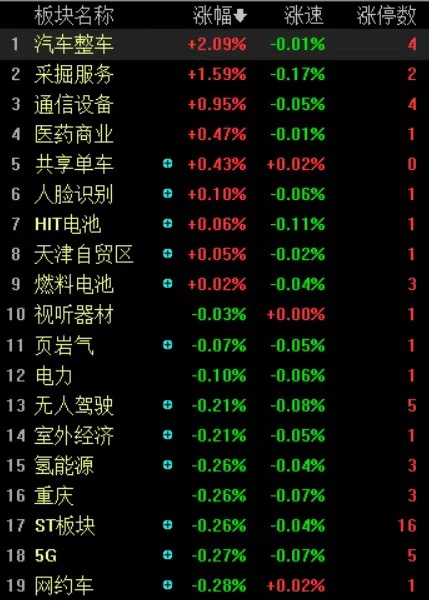 有色、军工、医疗保健、食品饮料、钢铁、农业、建材、化工、券商等板块跌幅居前。保险板块逆势活跃,中国人保涨近6%,燃料电池、5G概念等亦走强。