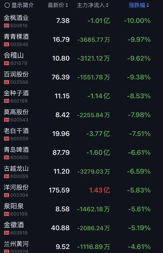 盘面上看,酿酒板块大幅下挫,金枫酒业、青青稞酒跌停,会稽山、百润股份跌幅超9%;