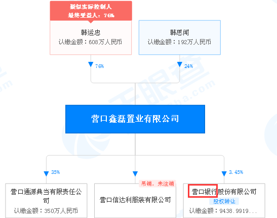 记者发现,金韩运忠投资比例达70%的营口鑫磊置业有限公司,正好持有营口银行股份有限公司3.45%的股份。