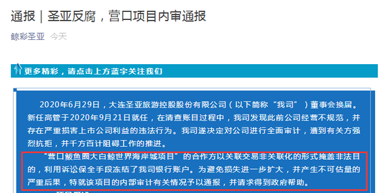 对此,大连圣亚名为“鲸彩圣亚”的公众号发布了《通报|圣亚反腐,营口项目内审通报》。