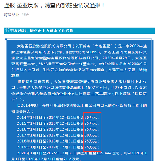 文章表示,据初步调查发现,大连圣亚原高管通过原商业管理部负责人张林操控上市公司,长期将大连圣亚公司场馆商业总面积达1597平方米,共27个商铺,以极不合理低价长期承包给自己的企业沙河口区四海工艺品商行( 以下简称“四海商行”)。
