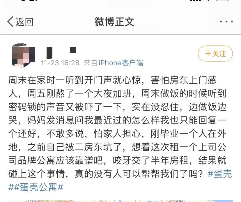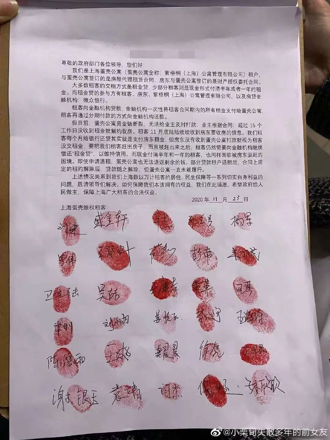 11月23日,北京的一个旅游博主站上了蛋壳公寓北京总部的大楼,在现场录的视频中,她说“是蛋壳逼我的”。后来她被警方拦下。还有一个女孩,拦在想要收房的房东前,争取居住的权利。