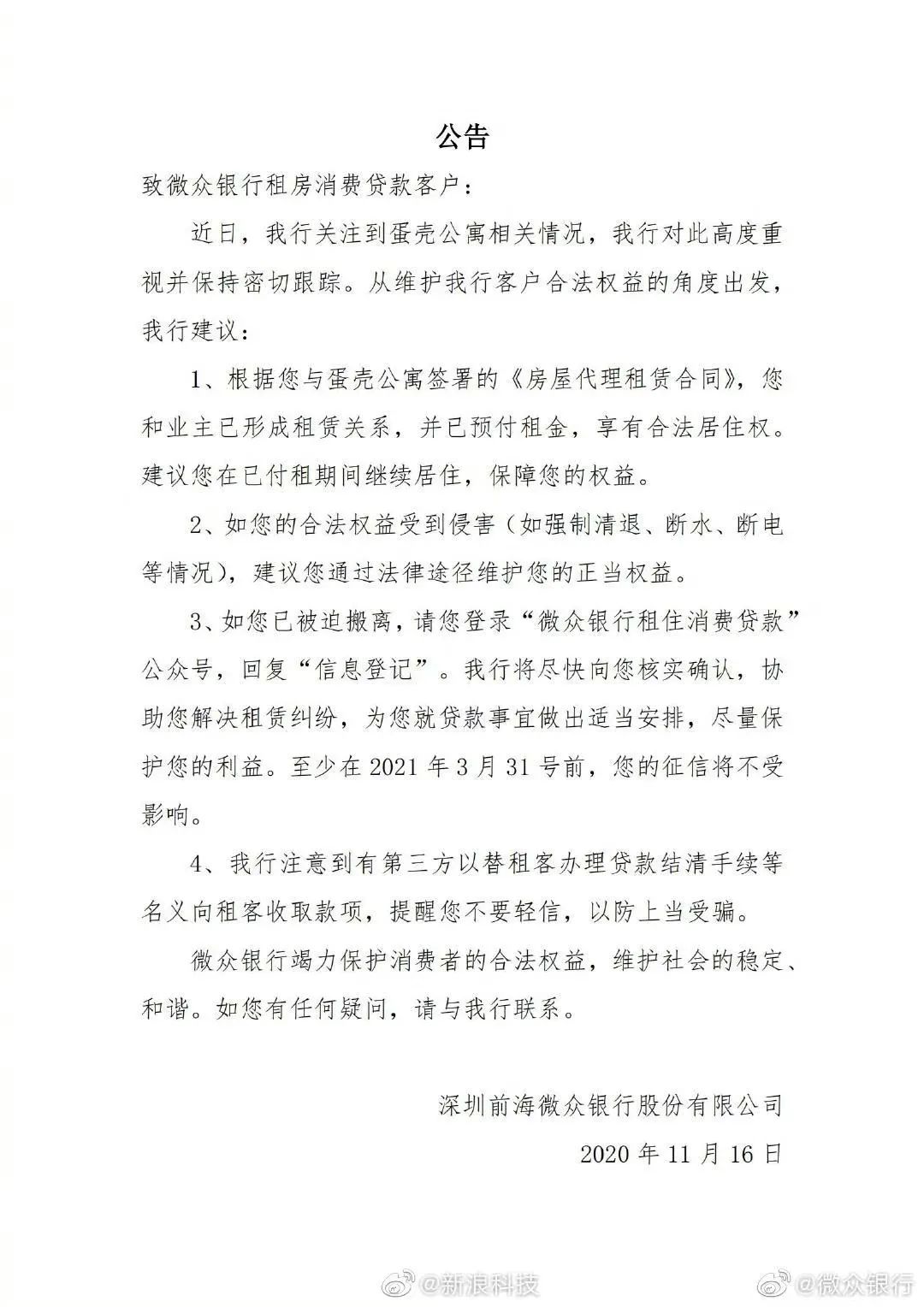 关于“租金贷”,微众银行在11月16日发了份公告。其建议办过“租金贷”的客户在已付租期内继续居住,如果遇到清退等行为,可通过法律途径维护正当权益。