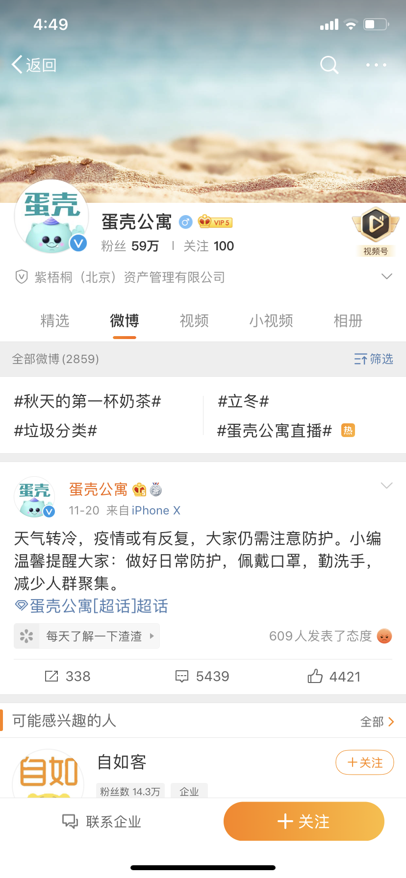 而与之格格不入的是,前几日,蛋壳公寓的股价出现了超过230%的暴涨。另外,蛋壳公寓的官方微博,近两日还在提醒大家“天气转冷”、“注意保暖”和“减少人群聚集”。