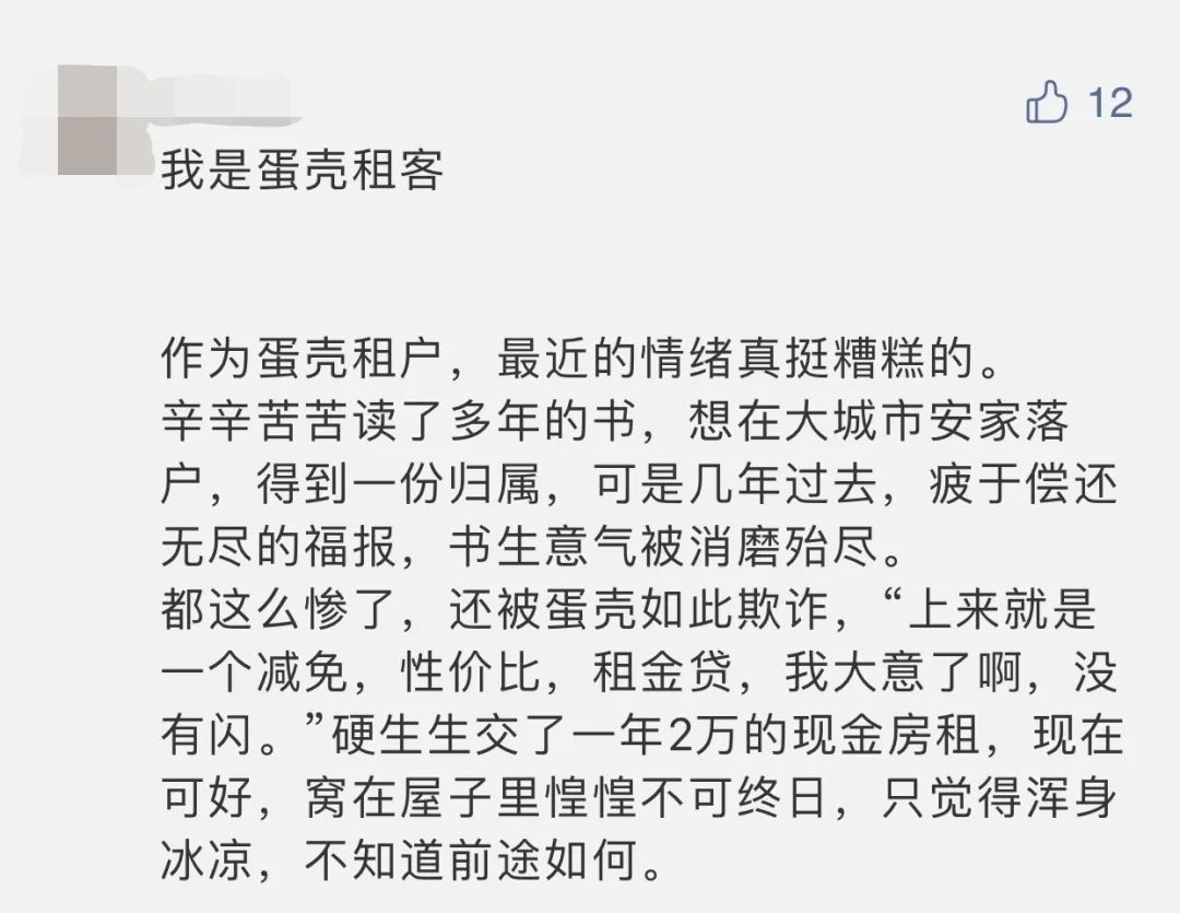 “现在一听到楼道里有脚步声,我就害怕,怕房东来换锁、断电。”有位蛋壳租客在群里分享自己的状态。