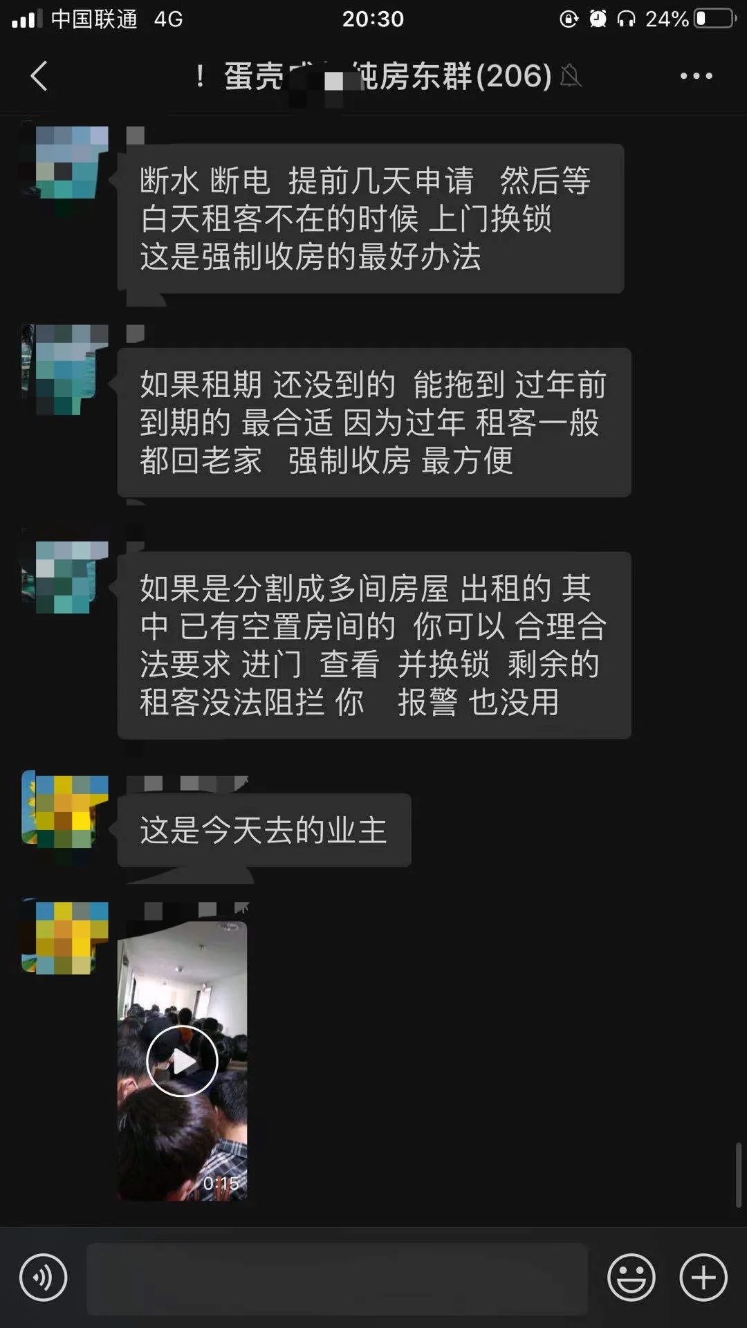 蛋壳房东群里,房东们在讨论强制收房的办法