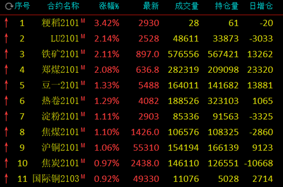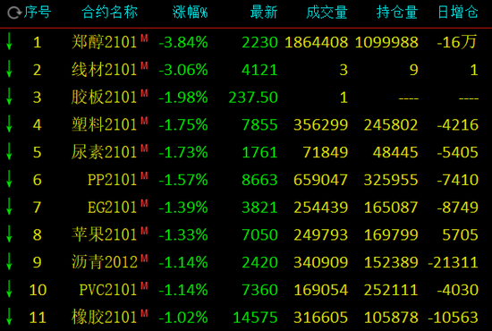 热点栏目11月26日,国内期市收盘,甲醇尾盘跳水跌近4%,能化品飘绿,塑料、尿素跌近2%,PP、乙二醇跌逾1%;黑色系普涨,铁矿石、动力煤涨逾2%;有色中,沪铜涨逾1%;农产品中,豆一、淀粉涨逾1%。