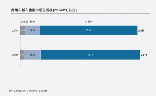 中重卡因其产品单价高和车队挂靠机制成熟的特点,2019年金融渗透率高达85%,并将继续缓慢提升。因此,中重卡成为商用车金融的主力细分市场,占据整体市场约83%。轻卡市场金融渗透率较中重卡则低得多,仅为35%,发展空间巨大,将保持稳步上升的趋势。