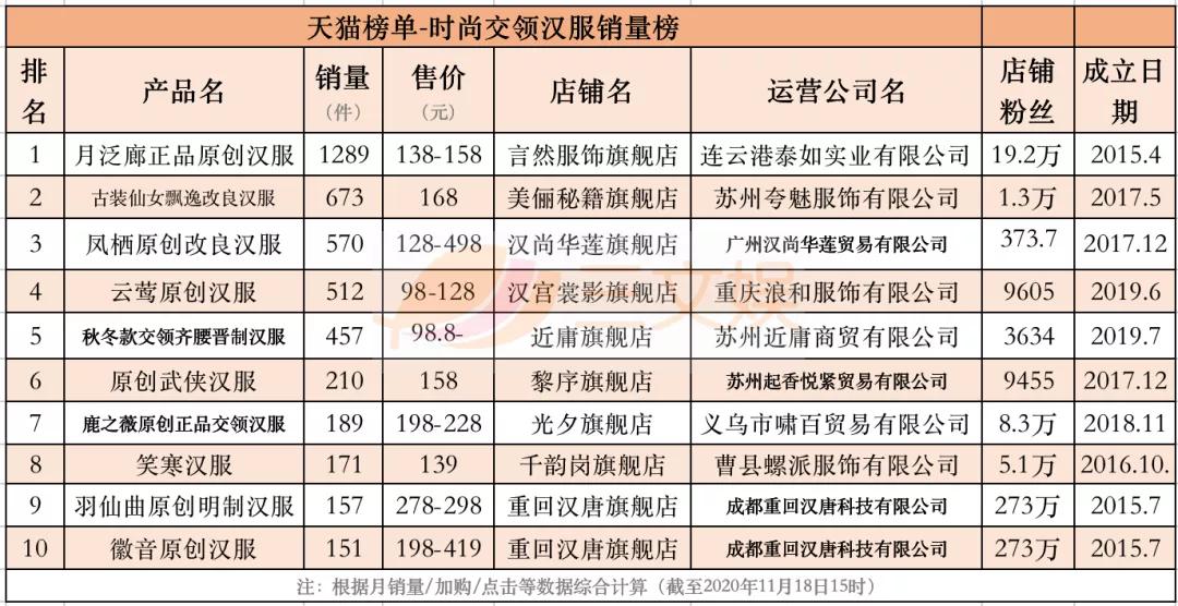 11月18日,三文娱统计了天猫榜单关于时尚秋冬汉服、时尚明制汉服、时尚系带汉服、时尚交领汉服、时尚宋制汉服、时尚汉元素汉服、轻奢秋冬汉服、奢涤纶汉服的8个销量榜,时尚刺绣汉服、时尚精致汉服的2个口碑榜,以及汉尚华莲汉服品牌榜,共11个榜单的Top10的汉服产品。