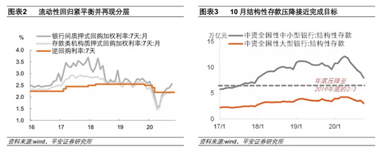 2020年5月是货币政策的分水岭。5月之前,货币政策是前瞻性“顶格”调整,先后祭出了再贷款、再贴现、定向降准1%、MLF降息30bp、下调超额存款准备金利率等政策工具,全力应对新冠疫情冲击。5月之后,央行停止降息,银行间流动性开始逐步收敛,6月央行窗口指导要求银行压降结构性存款、陆家嘴论坛郭树清主席指出“大规模刺激政策将来如何退出”、7月中央政治局会议“完善宏观调控跨周期设计和调节”、9月抗疫胜利表彰大会召开、10月易纲行长重提“把好货币总闸门”,货币政策正常化日趋明朗(图表1)。