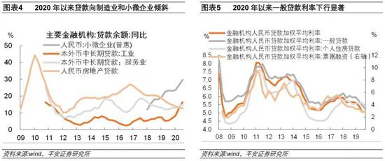 2020年以来信贷结构最大的特点:一是,融资结构改善,向制造业和小微企业贷款投放占比显著提升(图表4)。今年1-9月新增贷款16.3万亿中,制造业贷款增加2万亿,是2019年全年增量的2.6倍,占比12.2%(2018年这一比例只有约2.1%)。普惠小微企业贷款新增3万亿,比2019年1-9月多增1.2万亿。而新增房地产贷款占全部新增贷款的比例下降了3.7个百分点。这修正了我国2011年以来,新增贷款向制造业投放甚少,而主要流向房地产和基建的顽疾。二是,实体经济融资成本显著下行(图表5)。一般贷款利率也首次下行至住房贷款利率之下,9月企业贷款利率降至4.63%,比去年同期下降0.61个百分点;新发放普惠小微企业贷款平均利率为4.92%,较上年12月下降0.96个百分点。这基本实现了今年国务院部署的实体经济“融资成本明显下行”的目标。