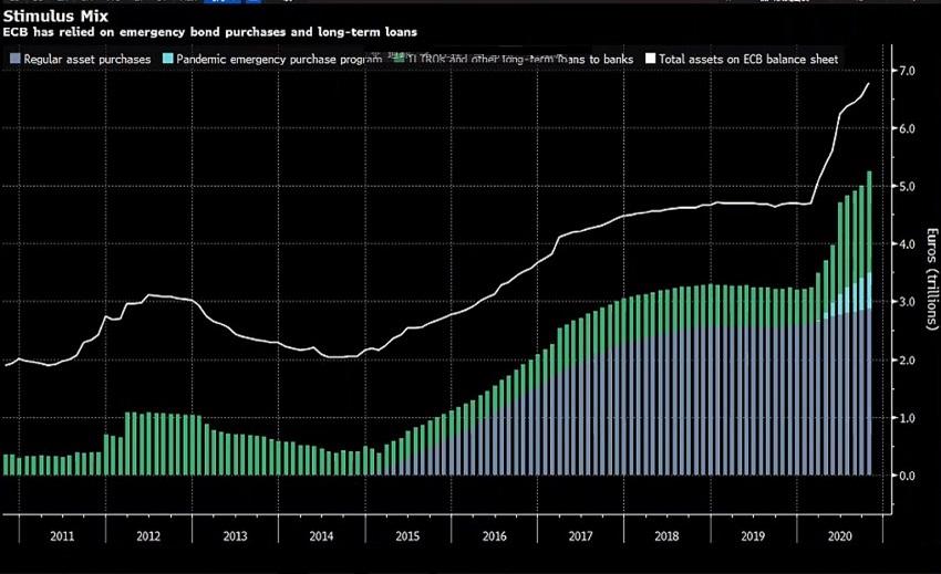 如下图所示,欧洲央行依赖于紧急债券购买和长期贷款。白线代表欧洲央行资产负债表上的所有资产,灰色柱代表常规资产购买,天蓝色柱代表疫情紧急购买,蓝色柱代表TLTRO和其他长期贷款