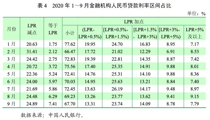 央行在《报告》中发布数据也显示,9月利率高于LPR的贷款在一般贷款中的占比为67.70%,利率等于LPR的贷款占比为7.41%,利率低于LPR的贷款占比为24.89%,贷款利率加减点区间整体较6月有所下移。