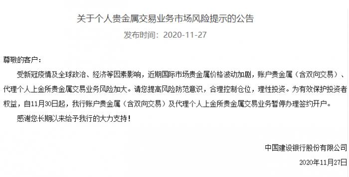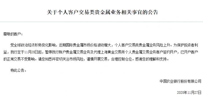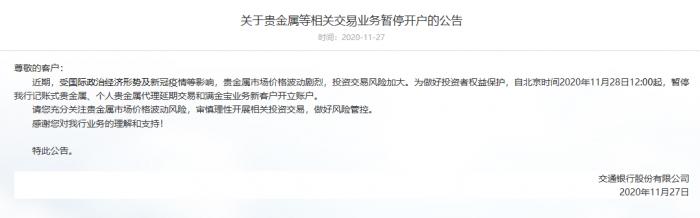 受全球政治经济形势变化影响,近期国际贵金属市场价格波动增大,个人客户交易类贵金属业务风险上升。为保护投资者利益,我行定于11月28日起,暂停我行账户贵金属交易业务及代理上海黄金交易所个人贵金属交易业务客户签约开户,已开户客户的正常交易不受影响。请您知悉并密切关注市场风险,谨慎开展交易,合理控制仓位。感谢您的理解和支持。