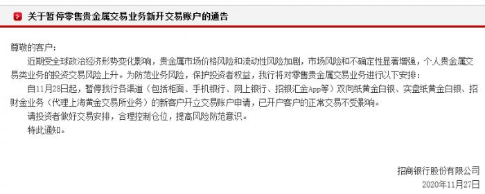 自11月28日起,暂停我行各渠道(包括柜面、手机银行、网上银行、招银汇金App等)双向纸黄金白银、实盘纸黄金白银、招财金业务(代理上海黄金交易所业务)的新客户开立交易账户申请,已开户客户的正常交易不受影响。