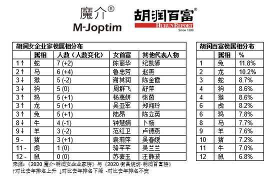 · 今年属马的女企业家进步最大,增加4人,以6人排到第二。蛇以7人保持第一,猴以5人排名第三。今年本命年的鼠仍然表现最差,前50名中一个都没有,羊和牛也表现较差。胡润表示:“无论是男企业家还是女企业家中,鼠、羊、牛都相对较少,可能这些属相的人不适合做企业家,说不定做学者或当官比较成功。”
