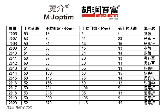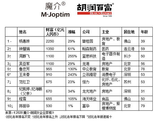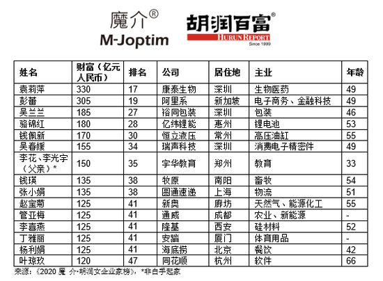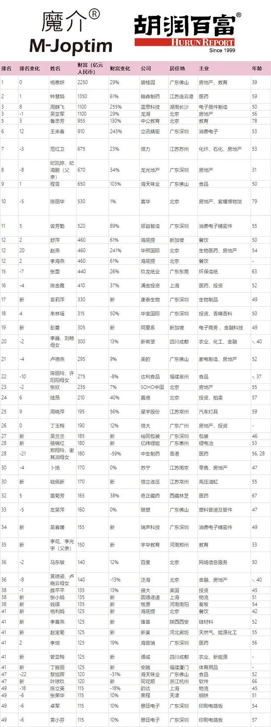 全球最大的财富榜排榜机构胡润研究院发布《2020魔介·胡润女企业家榜》