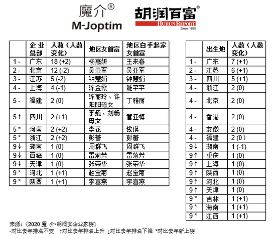 · 从出生地来看,粤商仍然最多,比去年增加1位至7位;苏商保持第二,比去年增加1位至6位;川商保持第三,比去年增加1位至5位;浙商人数连续三年减少,今年仅1位。白手起家的女企业家中,仍然也是粤商最多。