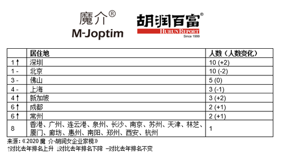 大湾区共18人上榜,占整张榜单35%,其中深圳10位,佛山5位。北京和深圳是中国女企业家首选居住地,各有10位。胡润表示:“从榜单结果来看,大湾区环境最适合中国女企业家创业。”