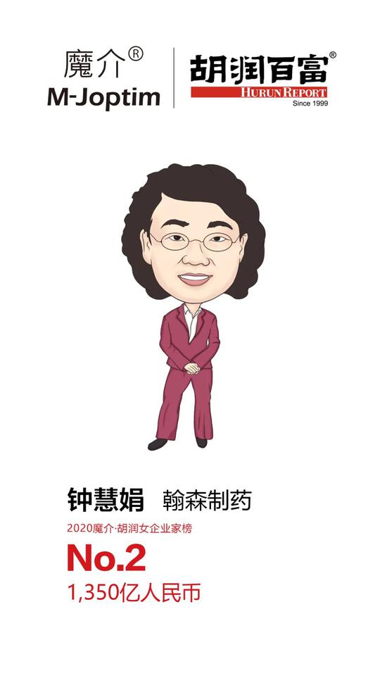 钟慧娟 59岁的钟慧娟财富上涨61%,以1350亿元首次成为中国及全球白手起家女首富,位列《2020衡昌烧坊·胡润百富榜》前20名。其创办的翰森制药去年在港上市。上市至今股价涨幅已逾95%,市值近2000亿元。