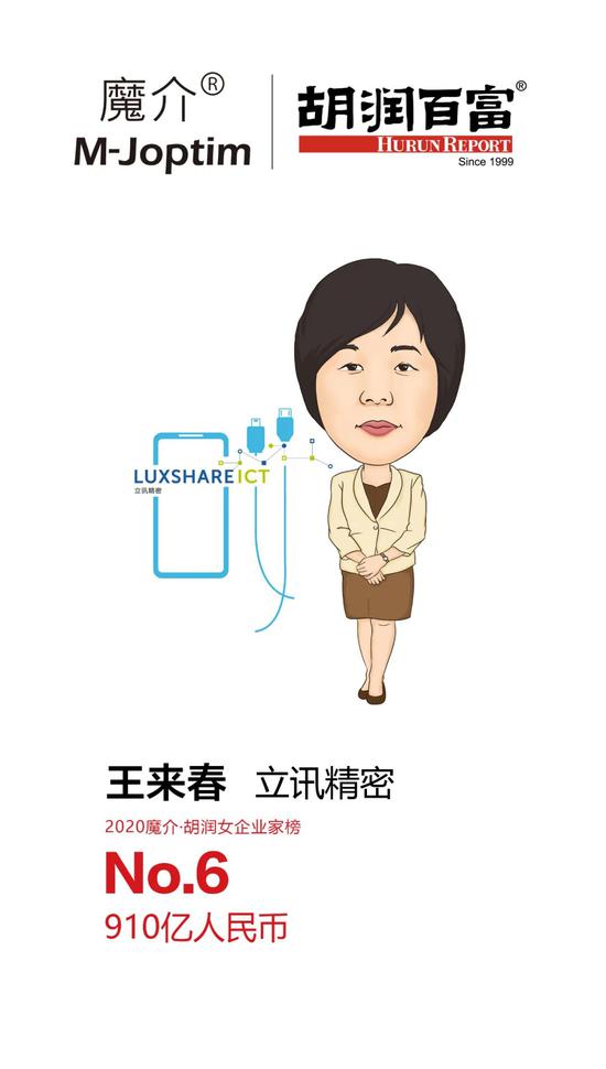 消费电子元件制造商立讯精密53岁的王来春财富增长2.4倍,以910亿首次进入前十