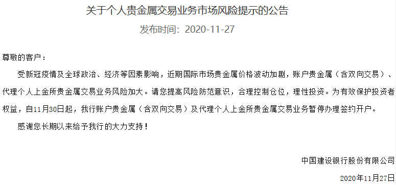 建行公告称,为有效保护投资者权益,自11月30日起,我行账户贵金属(含双向交易)及代理个人上金所贵金属交易业务暂停办理签约开户。