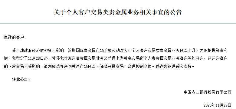 农行也公告称,我行定于11月28日起,暂停我行账户贵金属交易业务及代理上海黄金交易所个人贵金属交易业务客户签约开户,已开户客户的正常交易不受影响。