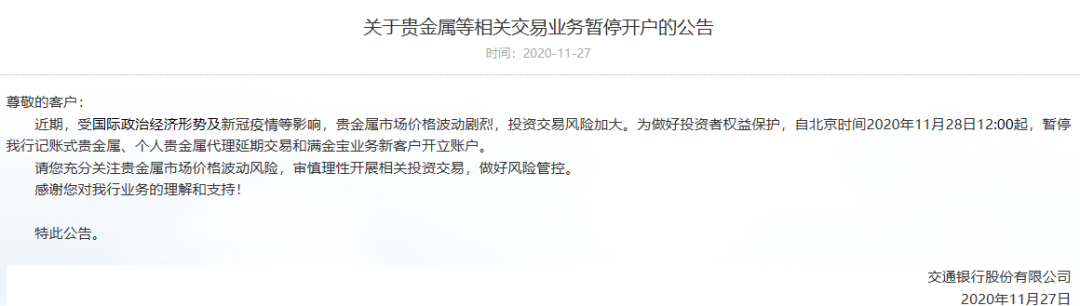 交行公告称,自北京时间2020年11月28日12:00起,暂停我行记账式贵金属、个人贵金属代理延期交易和满金宝业务新客户开立账户。