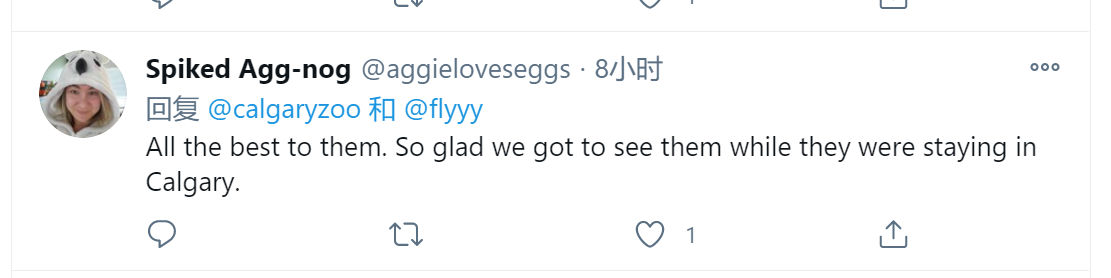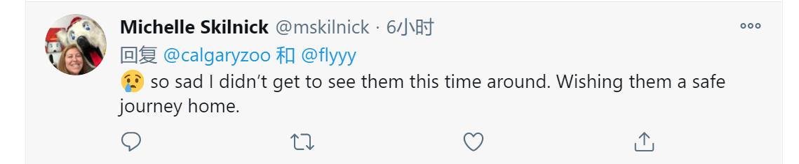 “大熊猫们一路平安!我们会想念它们的。感谢卡尔加里动物园(工作人员)的辛勤工作和照料”