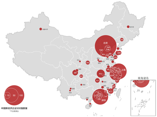 新经济500强企业上市动作较多,上市企业数量为385家,占比77%,未上市企业为115家,占比23%。在新经济企业初创阶段,新技术研发、新产品开发与生产、新市场开拓等都需要有足够的资金投入。单靠自身经营积累,很难快速形成规模,从而失去竞争优势。所以新经济企业需要高效率的融资积累,上市则是实现快速发展的有效途径之一。