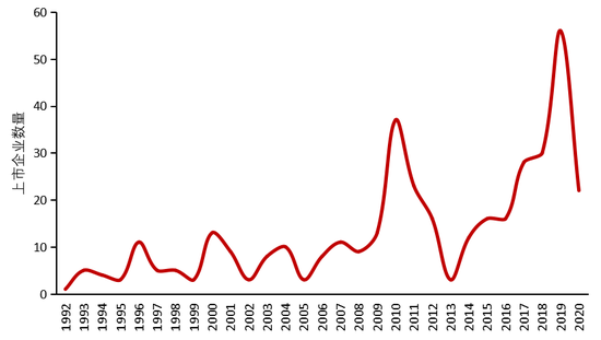 从上市时间上看,新经济500强中上市企业数量逐年递增,平均每年新增上市企业数量为14.26家,2010年及2019年上市企业数量出现两个峰值,单年上市企业数量分别为37家与56家,占到500强总上市企业总数的9.6%与14.5%。这两次高峰与创业板、科创板开板时间一致。