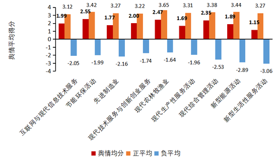新经济500强企业舆情均分为1.76分,正向舆论平均分为3.26分,负向舆论平均分为-2.26。总体舆论评价正面,社会影响较好。从行业领域分布来看,节能环保活动企业平均分值最高,达到2.55分。新型生活性服务活动企业平均分值较低,仅为 1.15分。正向舆论平均得分各行业领域较为接近,均在3.10分到3.65分之间;而负向舆论平均得分差距较大,现代农林牧渔业和现代技术服务与创新创业服务企业负向舆论均分较高,分别为-1.64分和-1.74分,新型生活性服务活动企业负向舆论均分最低,为-3.06分。