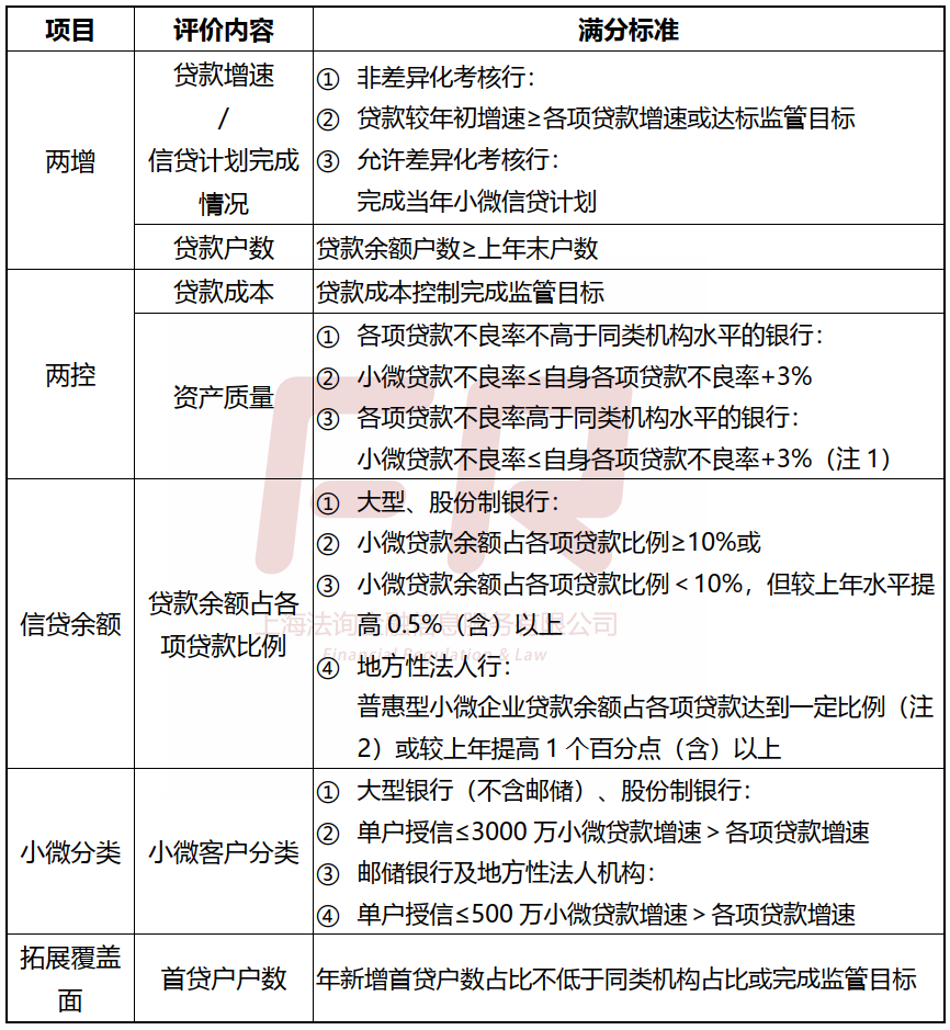 注2:“一定比例”具体标准:1)城市商业银行:20%;2)民营银行:30%;3)农村中小银行机构(不含村镇银行):扩大口径40%,小微口径25%;4)村镇银行(如参与评价):扩大口径85%,小微口径70%。
