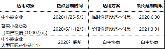 银保监发〔2020〕6号文中明确了主要针对中小微企业的还本付息延期计划(下表所示)。针对湖北地区适用“延期还本付息”政策的企业,设立专项信贷,要求降低融资成本1%以上(较2019年水平)。