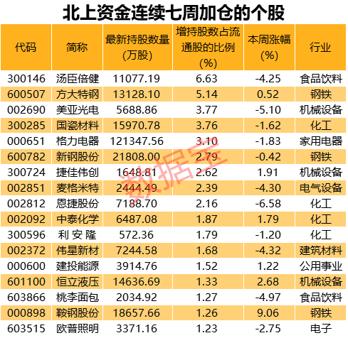 将时间拉长,17股被北上资金连续七周加仓。从持股比例变动情况来看,汤臣倍健获加仓幅度最大,较七周前增持股数占流通股的比例6.63%;其他连续加仓的还有方大特钢、美亚光电、国瓷材料、格力电器等。