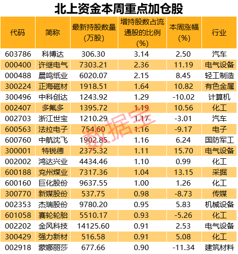 本周北上资金加仓股共678只,以增持股占流通股比例来看,加仓幅度超0.5%的有50只。汽车板块的科博达加仓比例最大,最新持股数为306.3万股,增持股数量占流通股比例为3.14%;紧随其后是许继电气,加仓幅度为2.36%;其他加仓幅度靠前的还有晨鸣纸业、正海磁材、中科创达等。