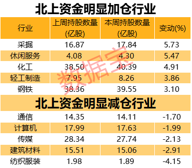 数据宝统计显示,本周北上资金持股数量环比增加行业17个。采掘、休闲服务、化工、轻工制造、钢铁等行业北上资金持股数量增幅靠前,其中采掘行业北上资金持股数量环比增加最为显著,北上资金本周末持有该行业17.84亿股,环比增加5.73%。
