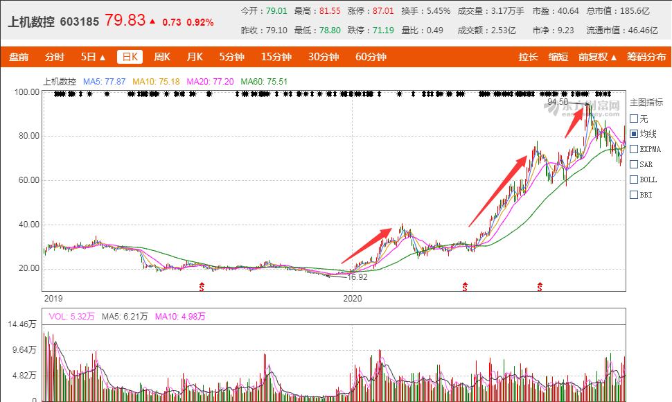 上机数控是今年名副其实的大牛股,该公司股价从年初的20元左右启动,一路上涨至10月中旬最高点94.5元/股,涨幅超过4倍。截至9月30日,其A股股东数仅8391户。