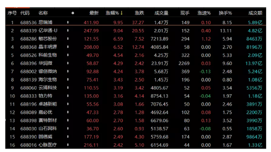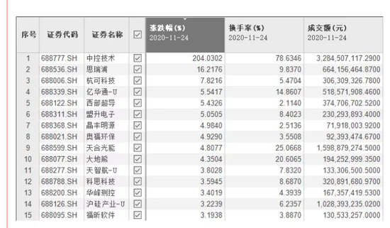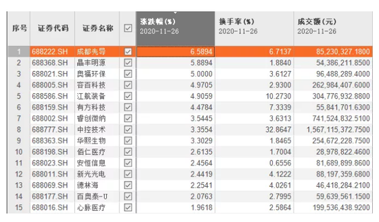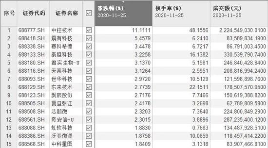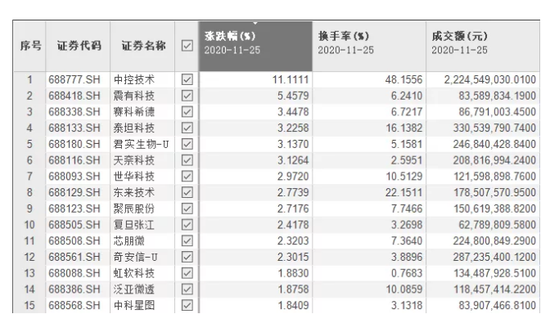 成交额上看,截至收盘,科创板全天成交额275.36亿元,较上个交易日有所放大。新股中控技术全天成交额达32.84亿元为当日最高,天合光能成交额达15.98亿元位居第二,有133只个股成交额不足1亿元。