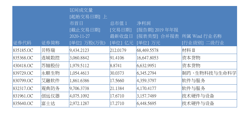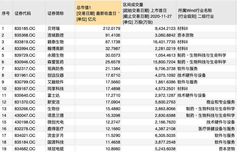 据Wind数据,贝特瑞(835185.OC)、连城数控、颖泰生物(833819.OC)、翰博高新(833994.OC)等19股总市值逾10亿元。龙泰家居(831445.OC)、方大股份(838163.OC)等总市值不足10亿元。