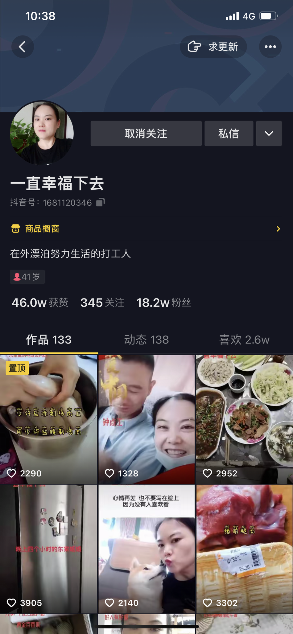 “一直幸福下去”的抖音号截图。而对于媒体曝光的带货问题,该雇主说是她提议的,“她(钟点工)一开始玩抖音也不是冲着带货去的,只是内容逐渐吸引了很多粉丝,个人外形、说话吐字也都适合。带货也是我们建议的。她工作很辛苦,周一到周五每天10小时,双休日每天也七八个小时,就是为了多赚点钱。”