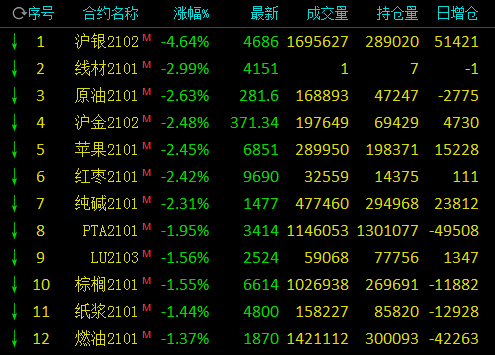 热点栏目11月30日,国内期市收盘涨多跌少,有色大涨,沪铜、国际铜涨近4%,沪锌、沪铝涨近3%;贵金属大跌,沪银跌近5%,沪金跌逾2%;原油午后跳水一度跌逾4%,橡胶冲高回落,苯乙烯涨逾3%;农产品分化,淀粉、鸡蛋涨逾2%,豆一涨近2%,苹果、红枣跌逾2%。