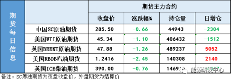 【1】WTI主力原油期货收跌0.48美元,跌幅1.05%,报45.34美元/桶;布伦特主力原油期货收跌0.61美元,跌幅1.26%,报47.88美元/桶;INE原油期货收跌0.66%,报285.5元。