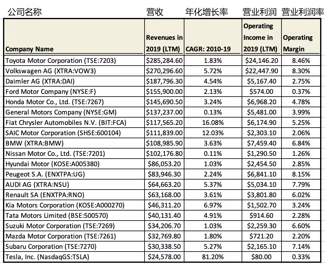 先来看汽车业的情况。总的来说,这是一个很大的市场,但整个市场增长缓慢:2010-2019年,全球已上市汽车公司的总收入年均增长率仅为3.5%,2019年总收入达到近2.5万亿美元。
